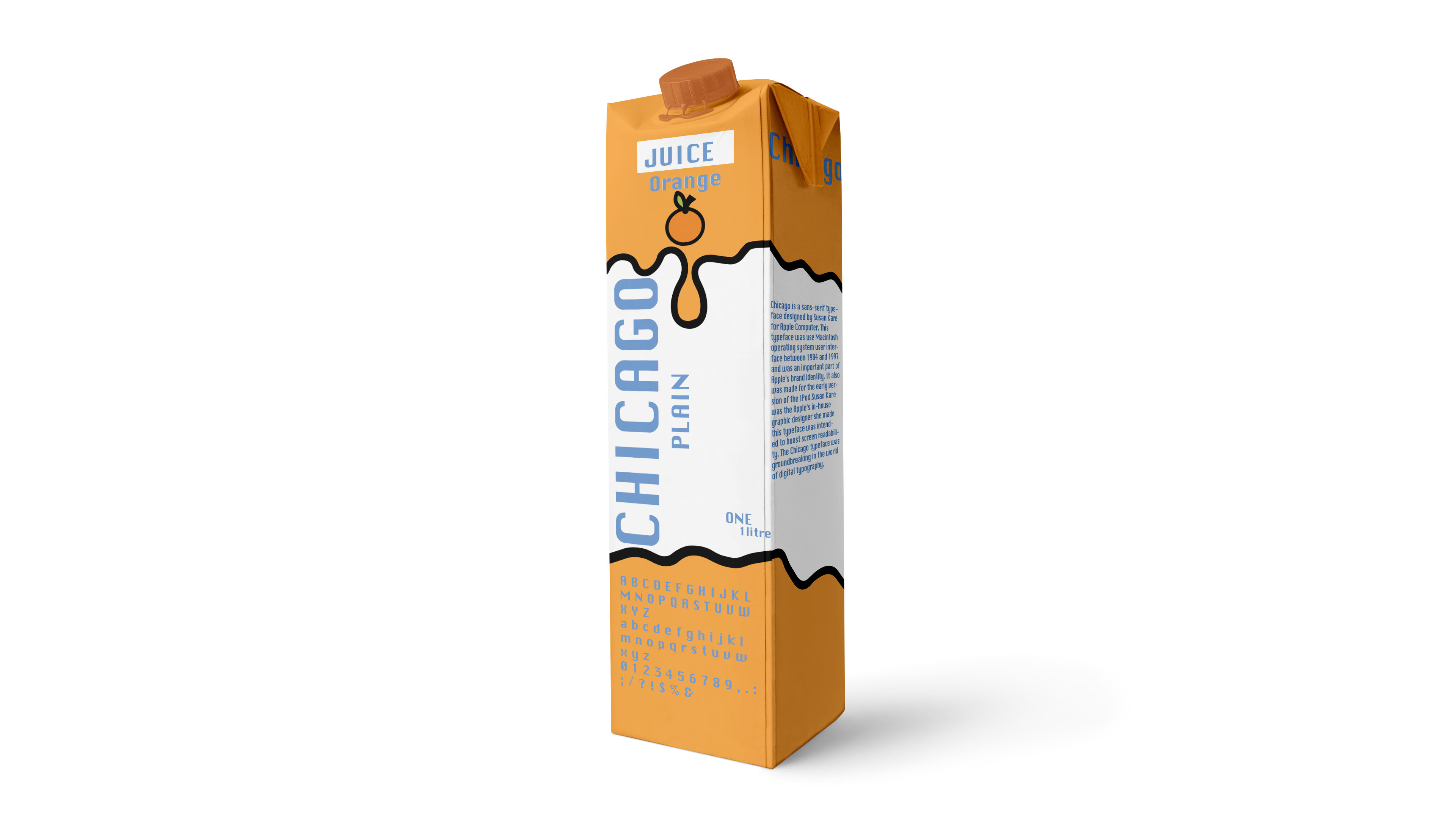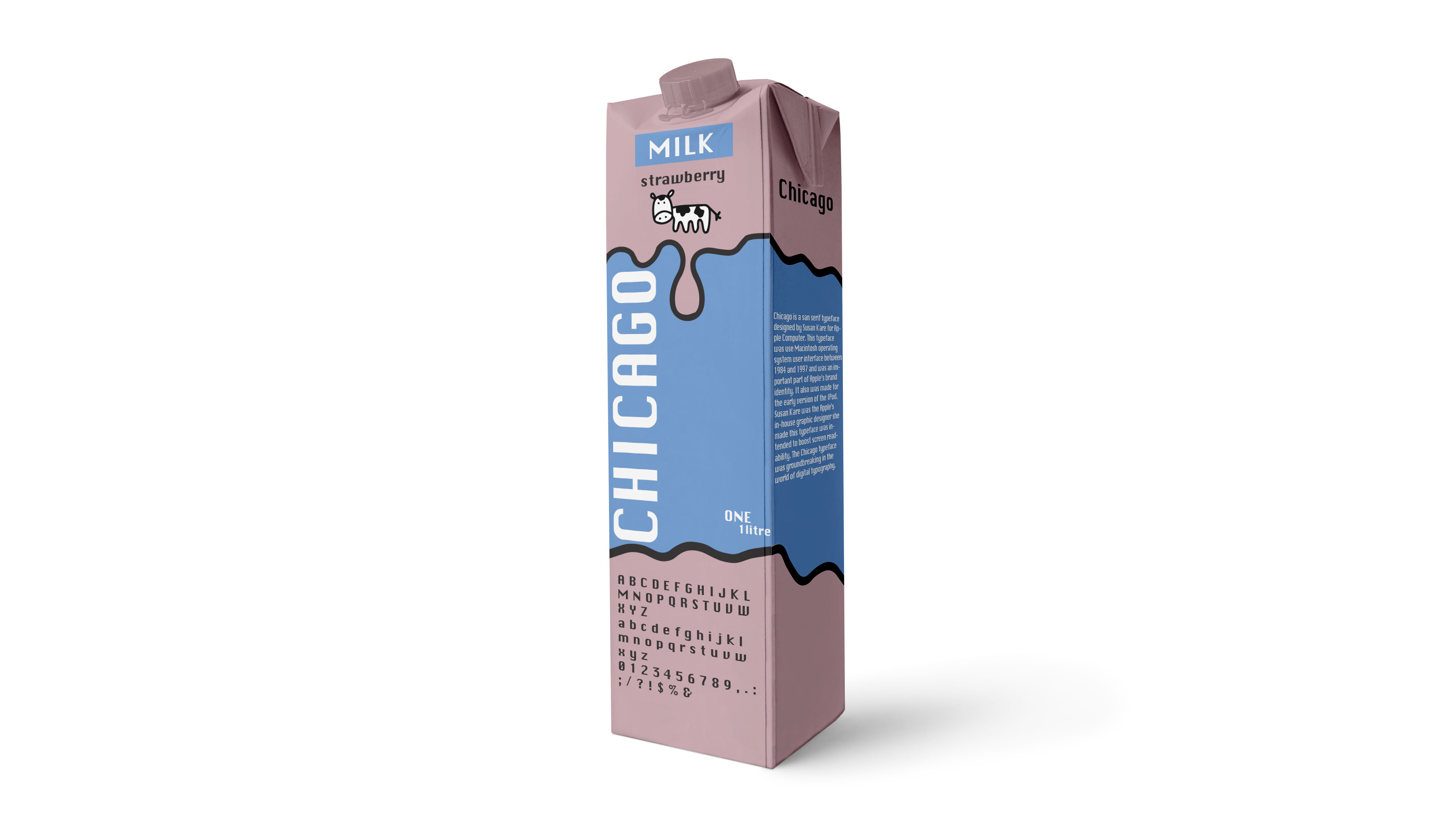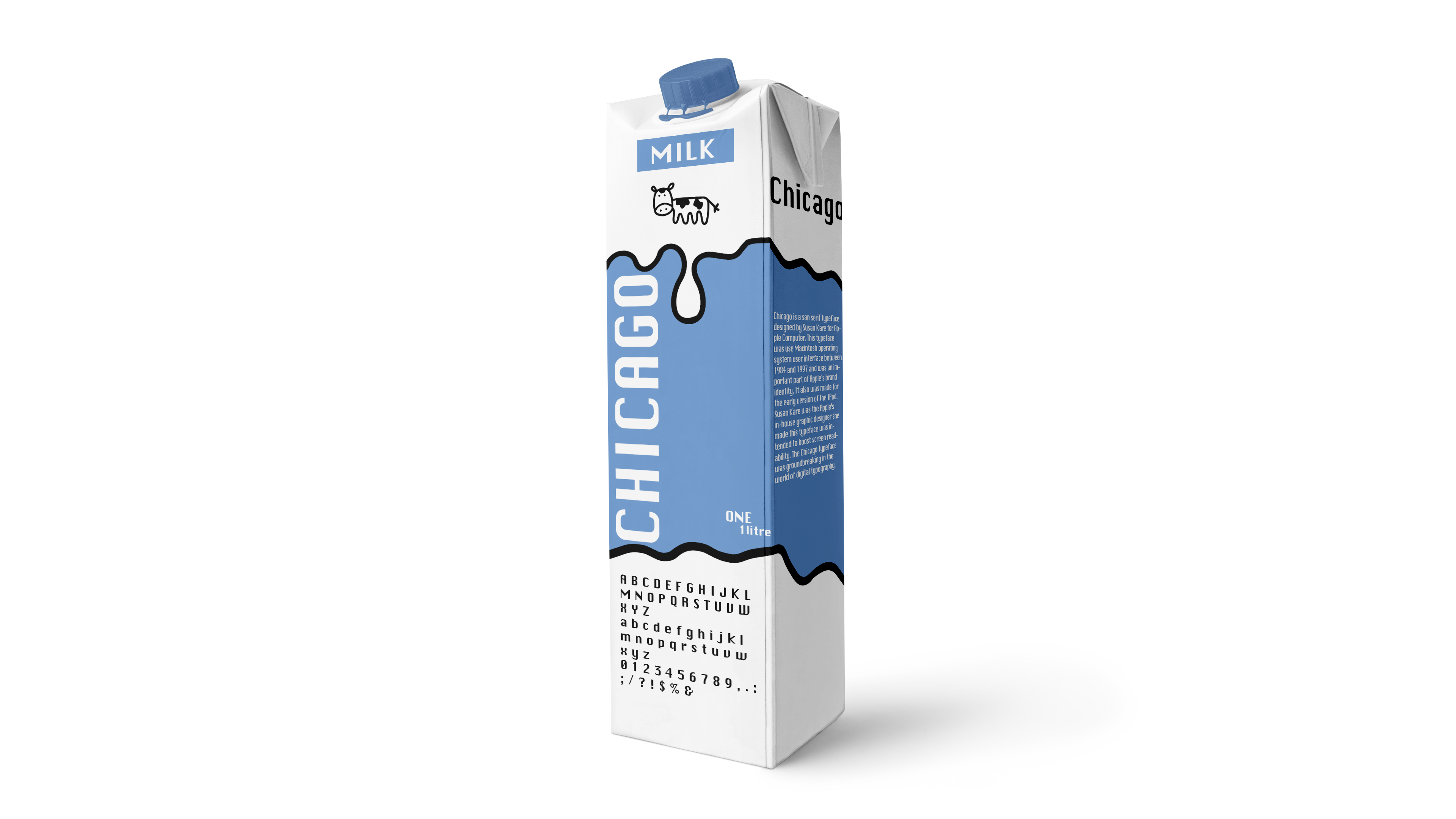 This project was about showing a typeface of my choice and making a design for it. I chose the typeface called Chicago and I decided to make milk cartons about showing off the typeface. The typeface was called Chicago and it was used or it was made for the first Mac.